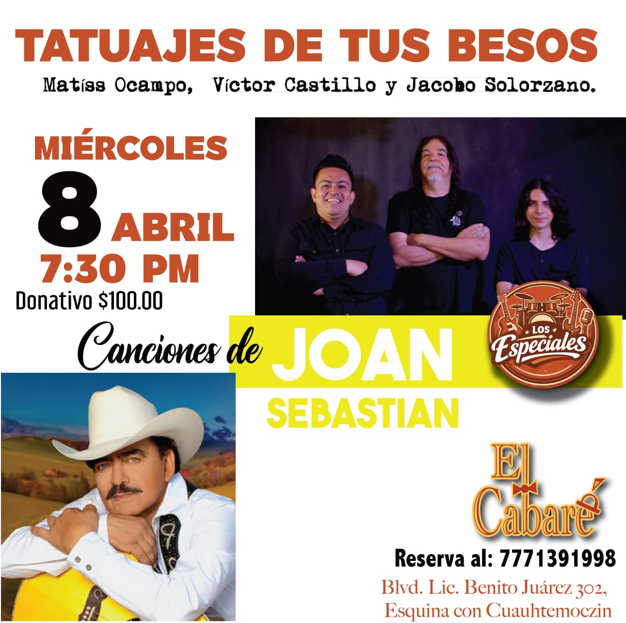Miércoles 8 (Balada, voz, guitarra, bajo, batería) / Especiales X: Joan Sebastian / Matíss Ocampo, Víctor Castillo y Jacobo Solórzano / 19:30 / $100 / Reserva: 777 1391998