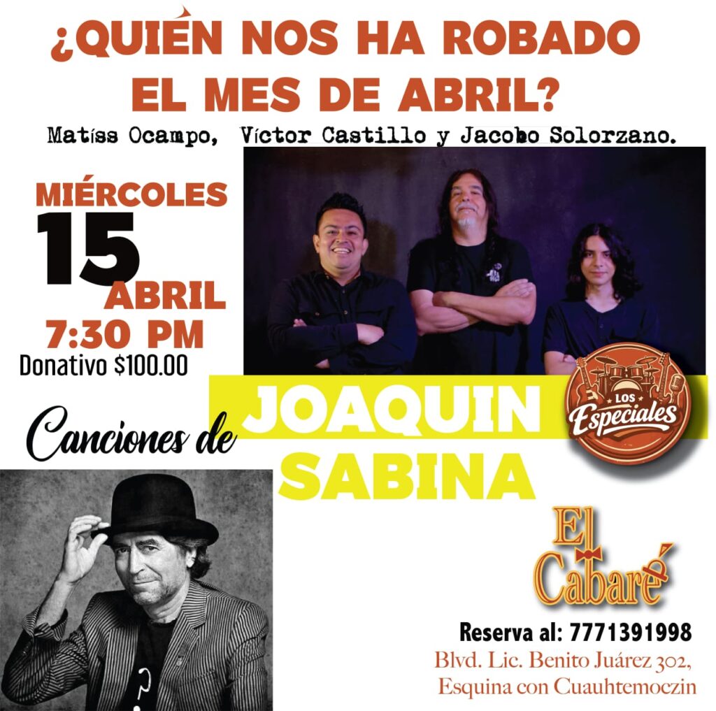 Miércoles 15 (Trova, voz, guitarra, bajo, batería) Especiales X: Joaquín Sabina / Matíss Ocampo, Víctor Castillo y Jacobo Solórzano / 19:30 / $100 / Reserva: 777 1391998
