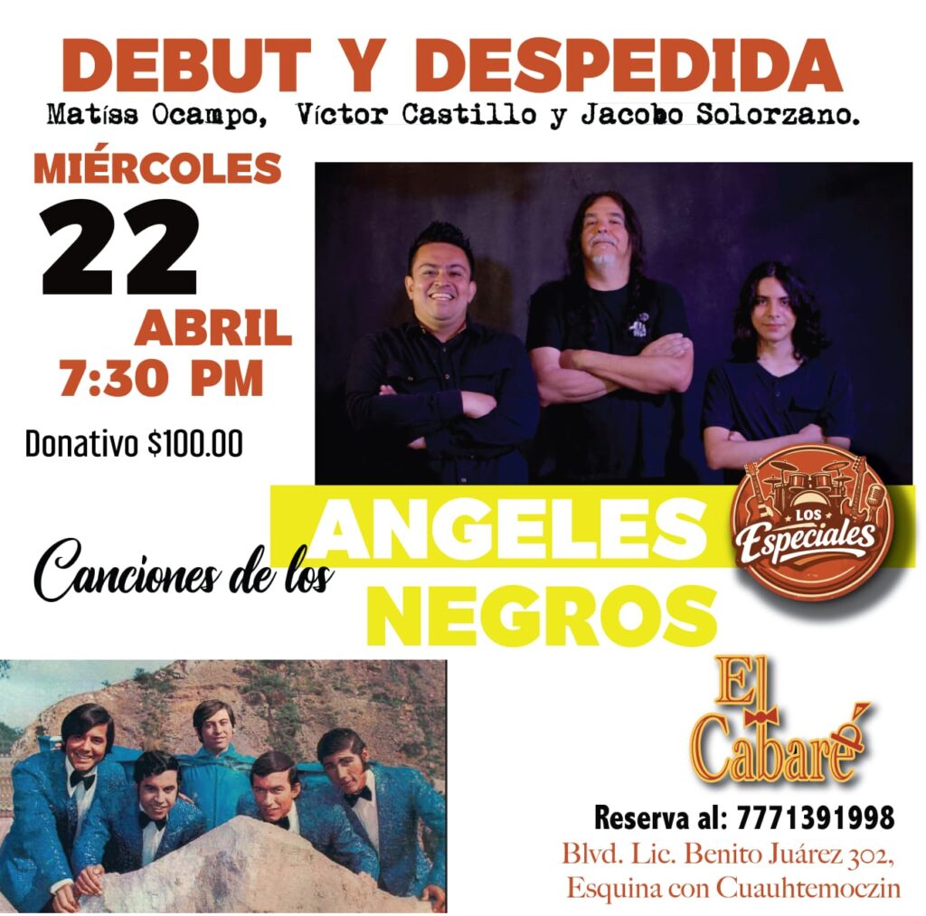 Miércoles 22 (Balada, voz, guitarra, bajo, batería) Especiales X: Ángeles Negros / Matíss Ocampo, Víctor Castillo y Jacobo Solórzano / 19:30 / $100 / Reserva: 777 1391998