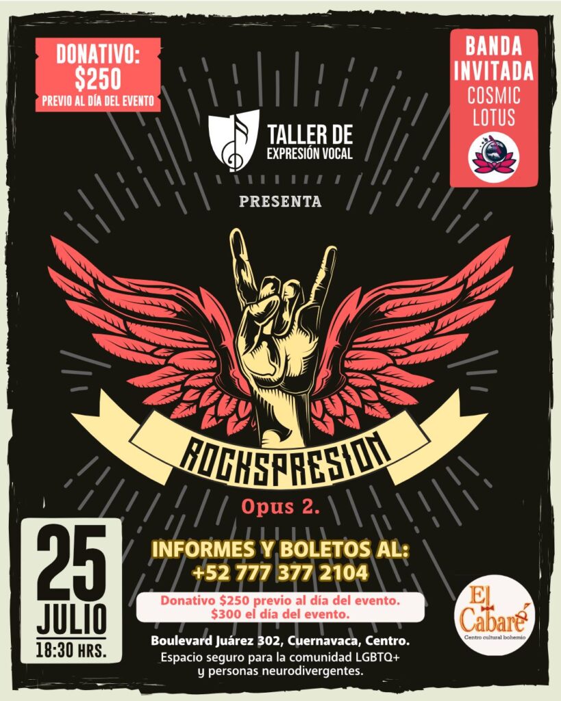 - (rock-blues) Beberecua / guitarra y voz: Rogelio Ortiz; bajo, Nelson Estrada, armónica, Aldo Jiménez, Batería Victor Castillo. Cooperación $100 pesos. No hay reservació