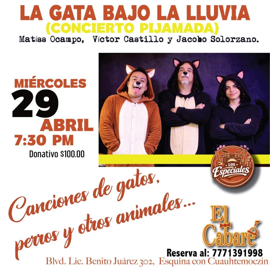 Miércoles 29 (Balada, voz, guitarra, bajo, batería) Especiales X: Canciones de animales / Matíss Ocampo, Víctor Castillo y Jacobo Solórzano / 19:30 / $100 / Reserva: 777 1391998