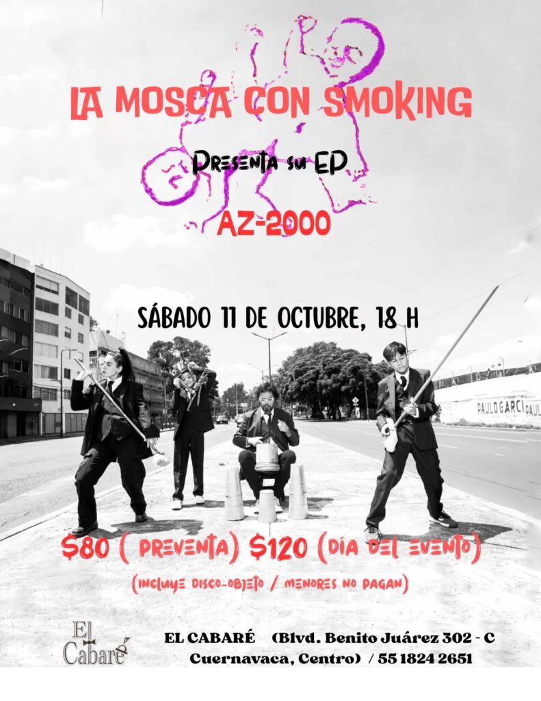 11/10 La mosca con smoking El grupo de rock alternativo, La mosca con smoking presentan su nuevo EP “AZ-2000” @mosca_con_smoking@la mosca con smoking 11 de octubre de 202518:00, $120, preventa: $80