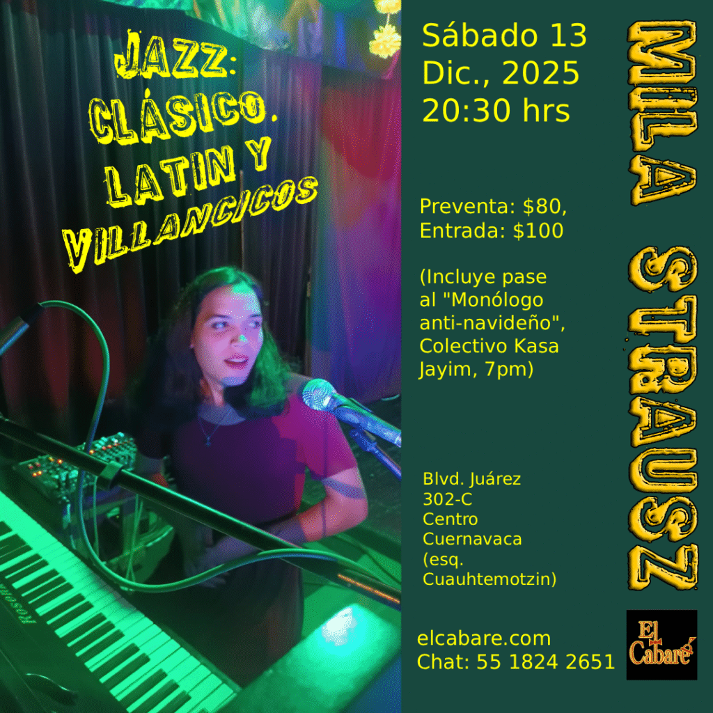 13 dic Jazz clásico, latino y un poco navideño Jazz en piano por Mila Strausz. Sábado 13 de diciembre, 8:30Preventa: $80 Entrada: $100 Incluye pase a Monólogo antinavideño a las 7 pm