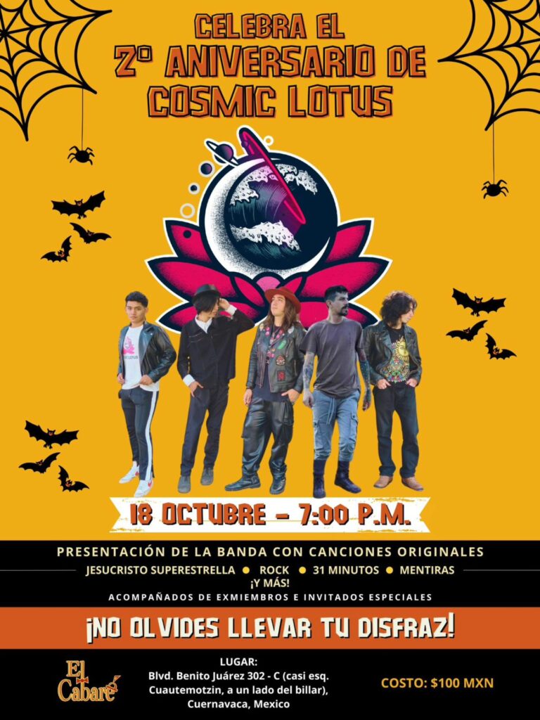 18/10 Cosmic Lotus, II Aniversario Banda cuernavaquense de rock y pop enfocada en covers populares y creación de música original. Además de poner música a la obra de Broadway “Jesucristo Superestrella” y hacer lives de TikTok. FB: Cosmic LotusIG: Cosmic Lotus 19 hs/ $100