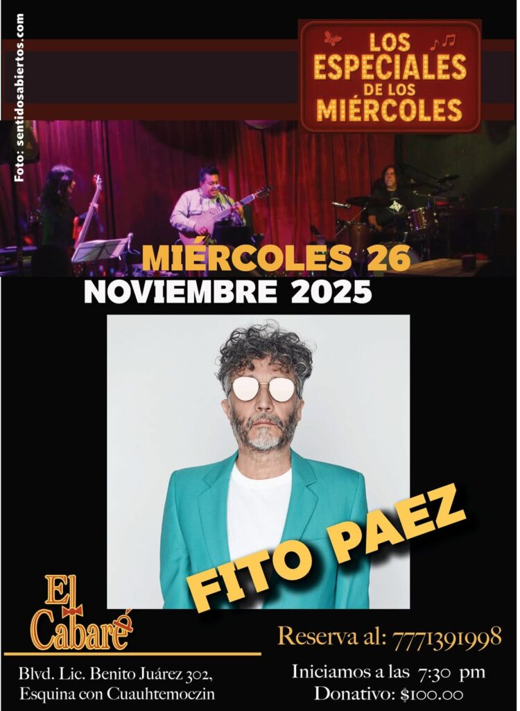26 nov Fito Páez en los Miércoles de especiales Matíss Ocampo, Víctor Castillo y Jacobo Solórzano canta su versión de Fito Páez.$100 Reserva: 77713 91998