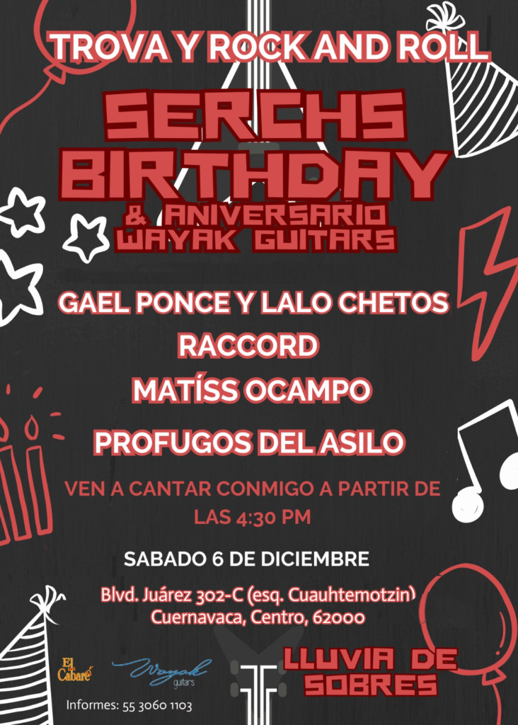 6 dic Serchs Birthday y Aniversari Wayak guitars Serchs Birthday y Aniversario Wayak Guitars, Sábado 6 de diciembre,16:30, Entrada libre Con cuatro espectáculos: Gael Ponce y Lalo Chetos, RACCORD, Matíss Ocampo y Prófugos del asilo