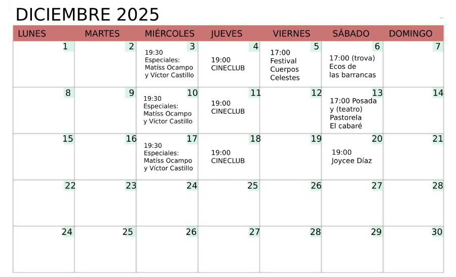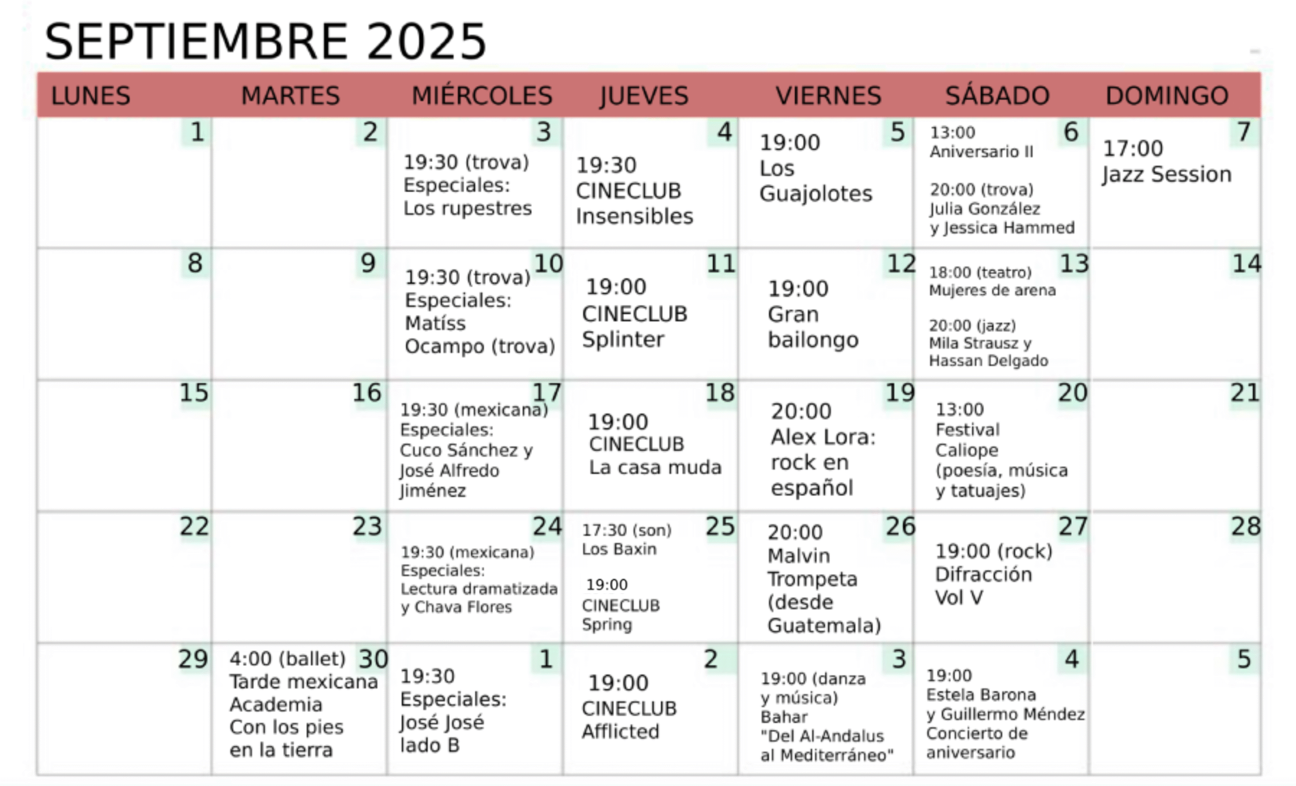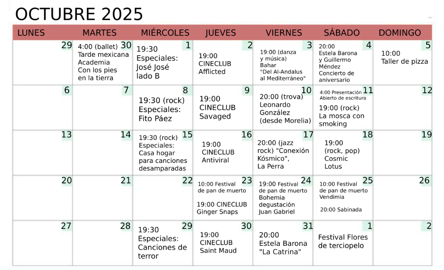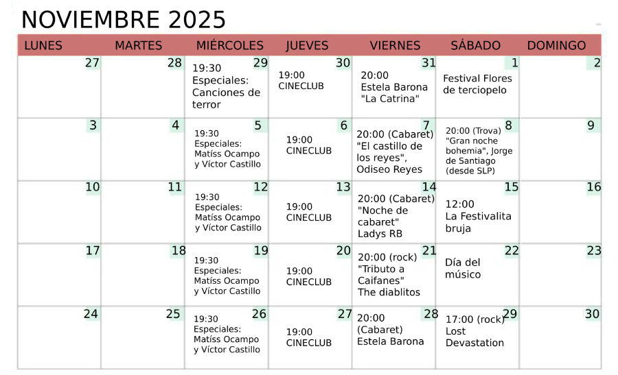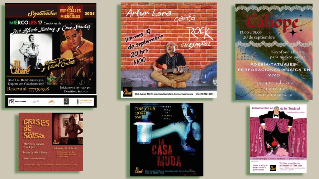 Consulta nuestros eventos en FB:cabarearte@elcabare_cuerna Horario Lunes a sábado, desde las 12 del mediodía SEPTIEMBRE 2025 27/09 Difracción Vol. V OCTUBRE 2025 17/10 Conexión Kósmica: La perra 15/10 Casa hogar para canciones desamparadas CALENDARIO Reserva en el chat: 55 1824 2651 PRÓXIMAMENTE La programación puede tener cambios de último momento.