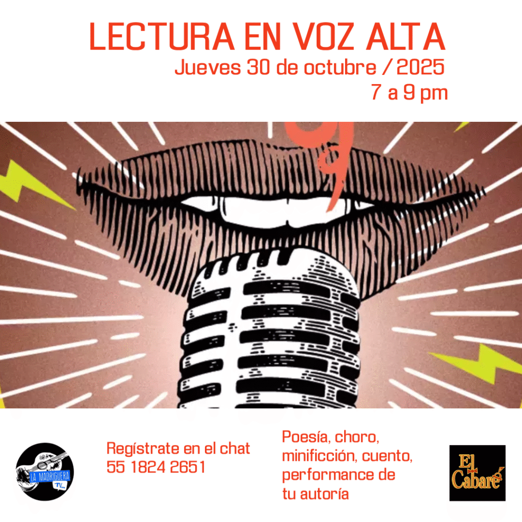 Lectura en voz alta Jueves 30 de octubreRegístrate en el chat: 5518242651 7 a 9 pm, orden conforme vayan llegando.