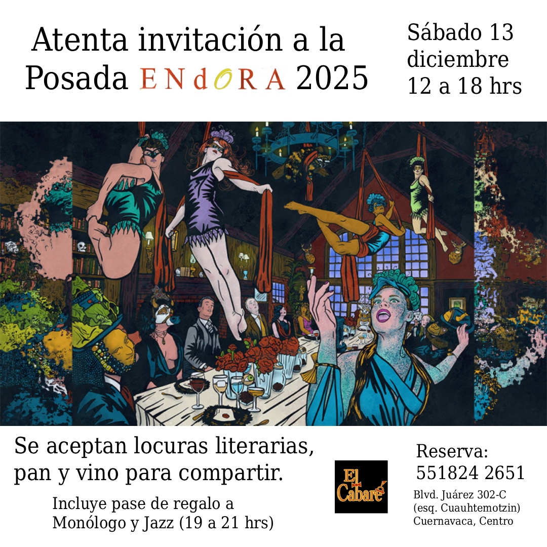 13 dic, Posada ENdORA Sábado 13 de diciembre12 a 18 horasPosada EndoraPan, vino y locuras literarias para compartir.endora.com.mx
